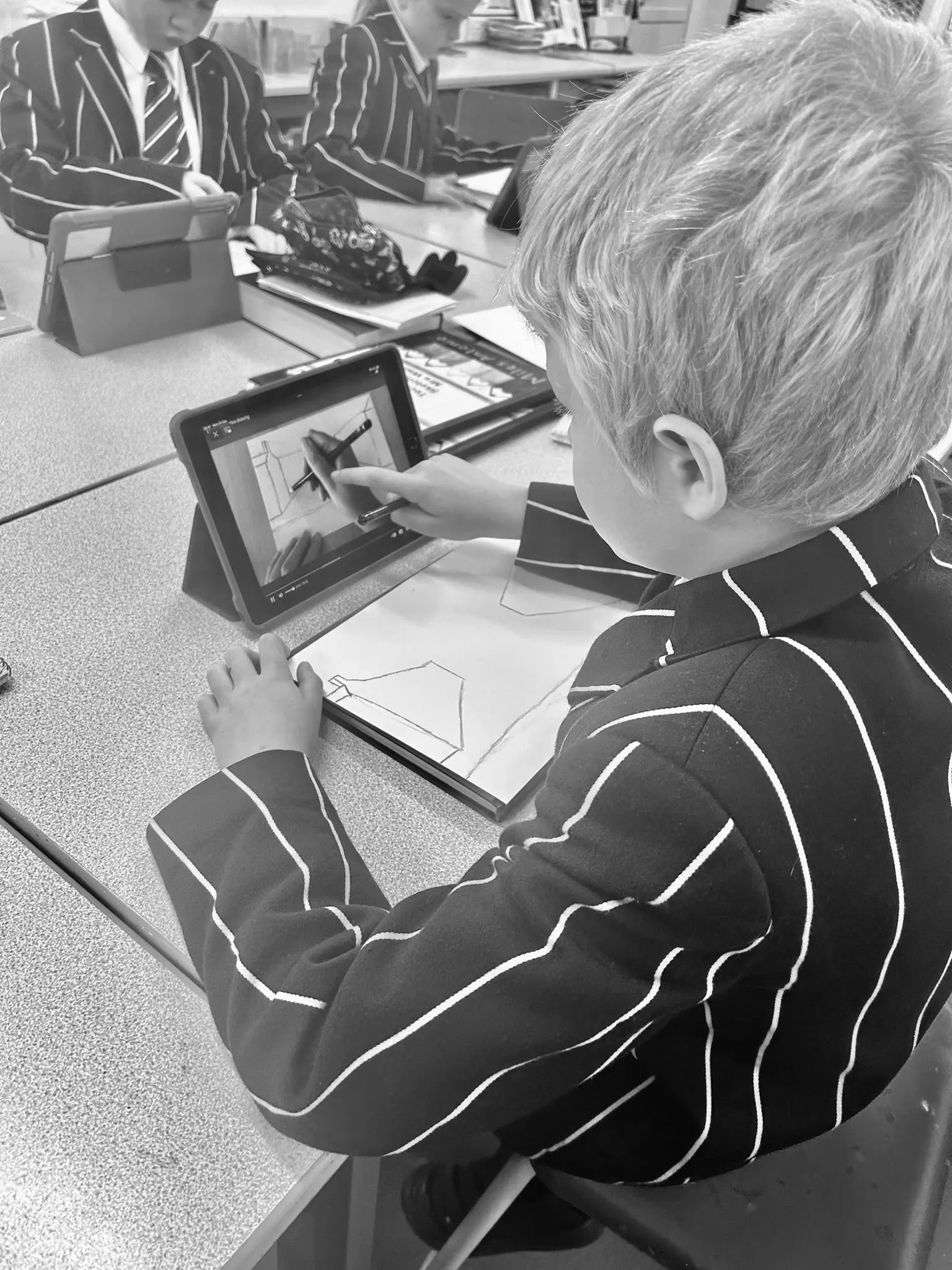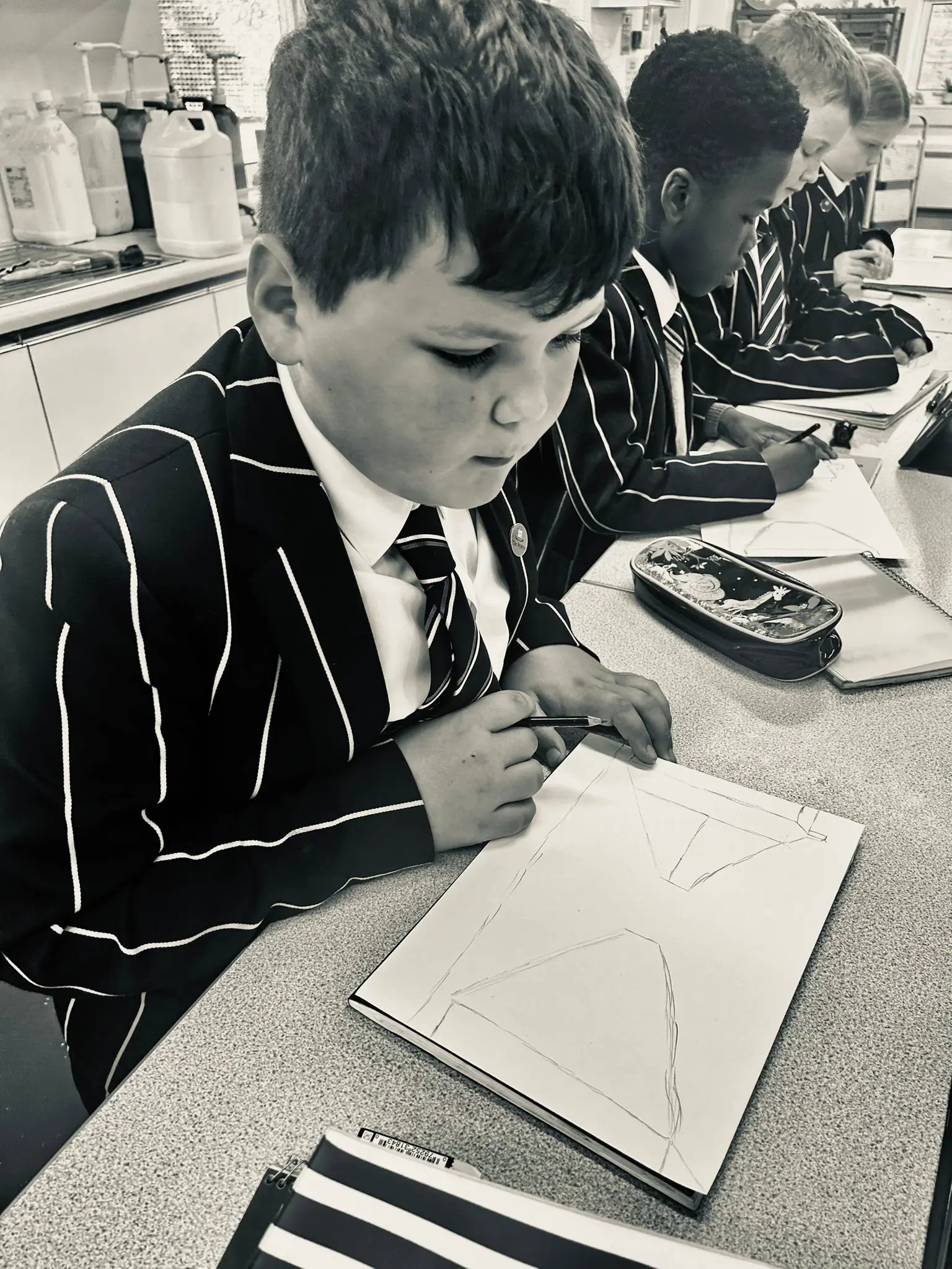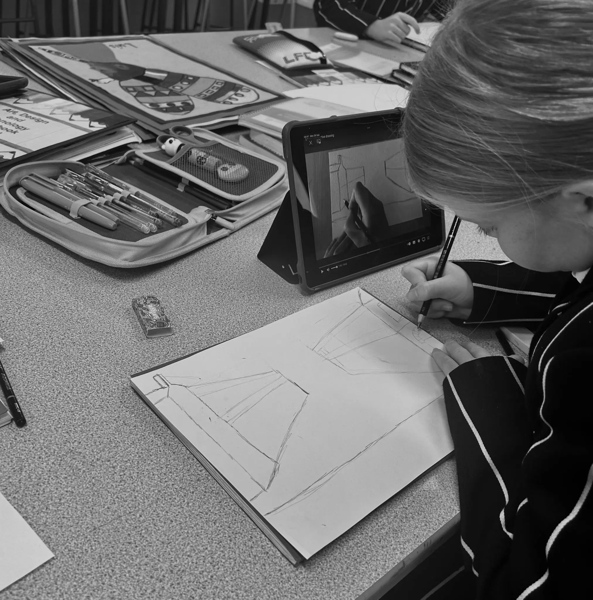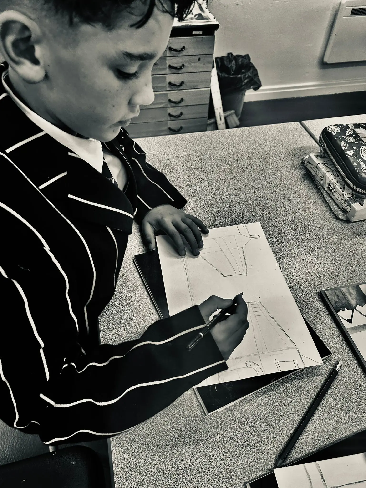 As part of their learning, the children had the opportunity to experiment with a range of drawing techniques, aiming to recreate the unique feel of Lowry's artwork in their own imaginative pieces. From carefully sketching buildings and streets to adding small figures bustling with life, the pupils explored how to make their scenes appear more three-dimensional, just like Lowry’s.